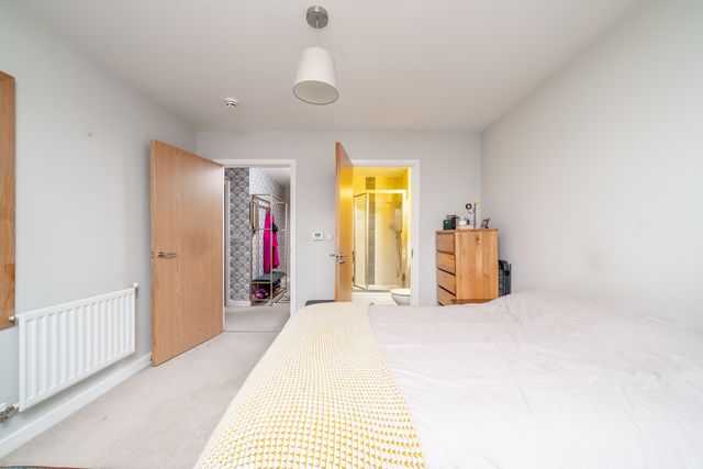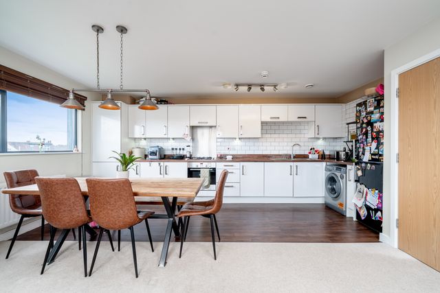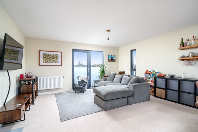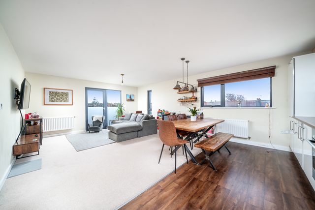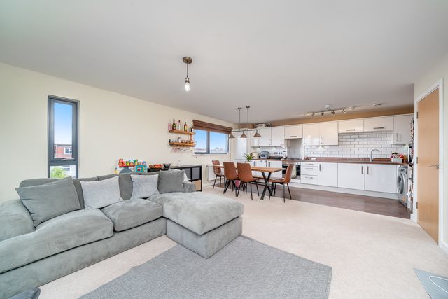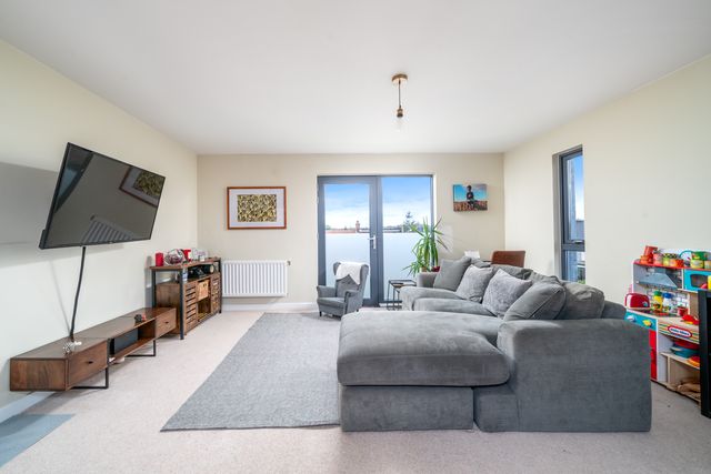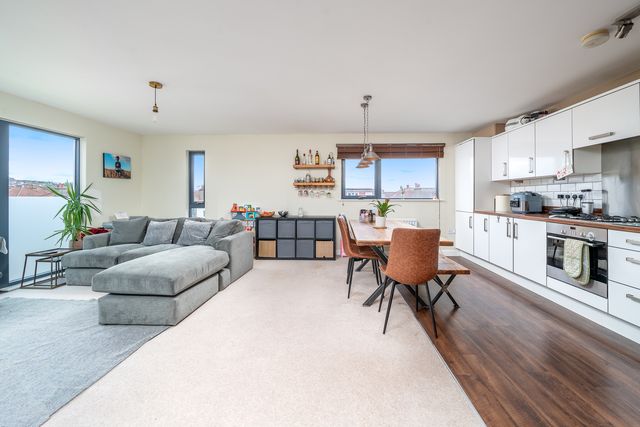 The property features a spacious open-plan living, kitchen, and dining area—ideal for entertaining, relaxing evenings, or everyday comfort. Large windows fill the apartment with natural light, creating a bright and airy atmosphere throughout. Both bedrooms are generously sized, with the principal bedroom benefiting from an en-suite shower room, while the second bedroom offers flexibility for guests, a home office, or additional living space. A sleek family bathroom completes the interior.